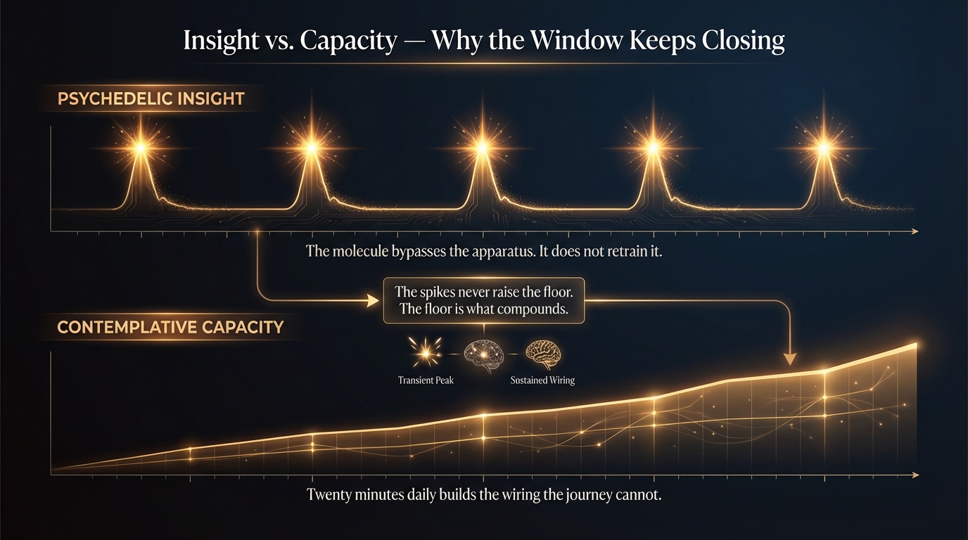 Integration is the slow, unglamorous work of rebuilding the apparatus itself -- the perceptual habits, the somatic patterns, the relational reflexes -- so that it can sustain what the molecule showed you without the molecule.
