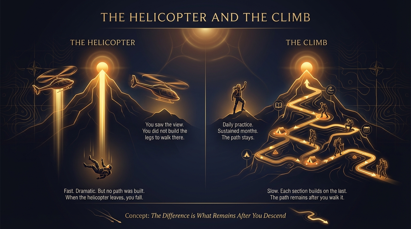 The climb is daily practice, sustained over months, inside a structure that provides real feedback. Not feedback about your psychedelic integration. Feedback about your patterns -- the ones operating right now, in this conversation, in the way you hold your shoulders, in what you do when someone says something you do not want to hear.